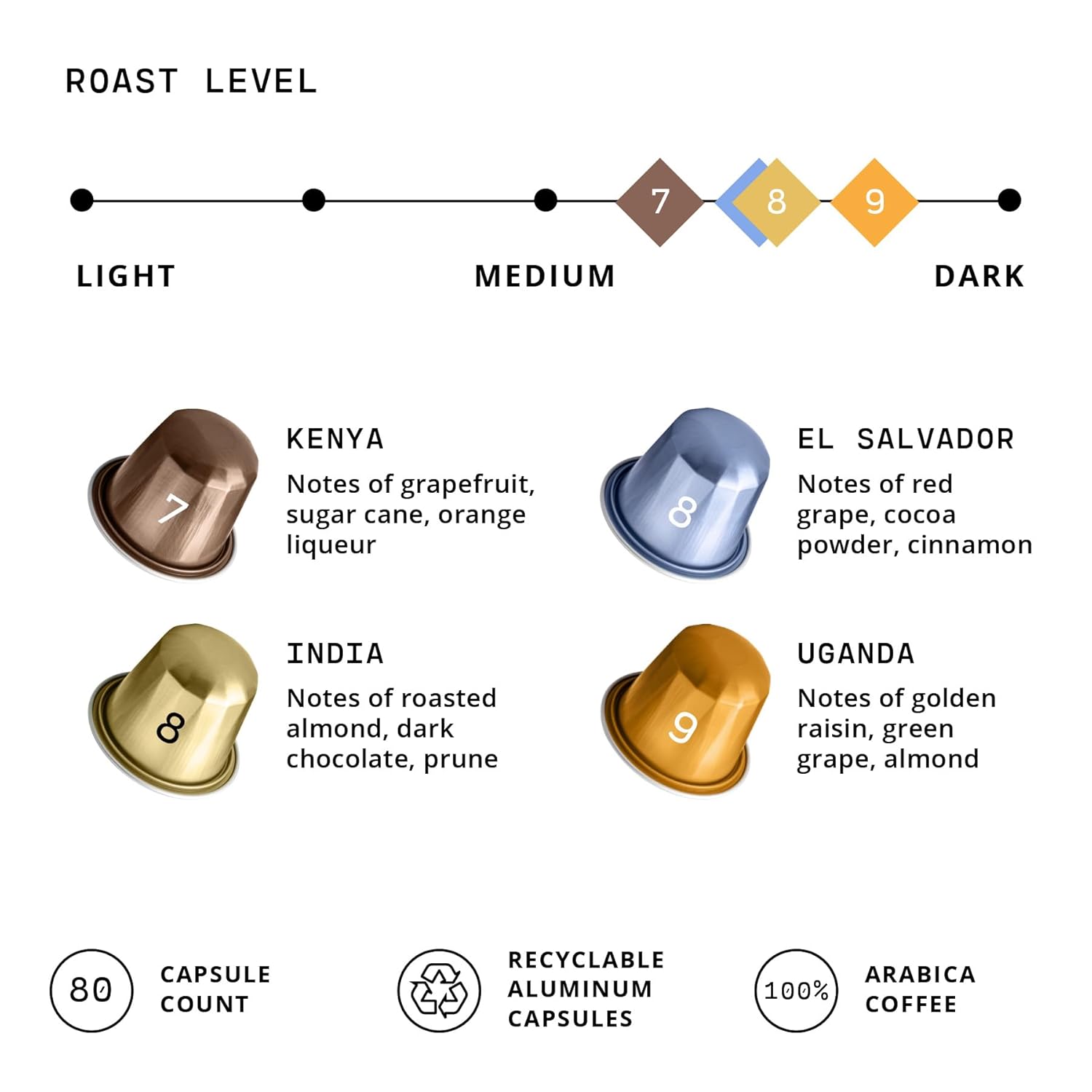 - FLAVOR FOR REAL: Explore Kenya (grapefruit + orange liqueur), India (dark chocolate + prune), El Salvador (red grape + cinnamon) and Uganda's (golden raisin + almond) vibrant tasting notes. Freshly roasted and ready to deliver a flavorful and rich shot of espresso. This premium, single-origin coffee is 100% Arabica.