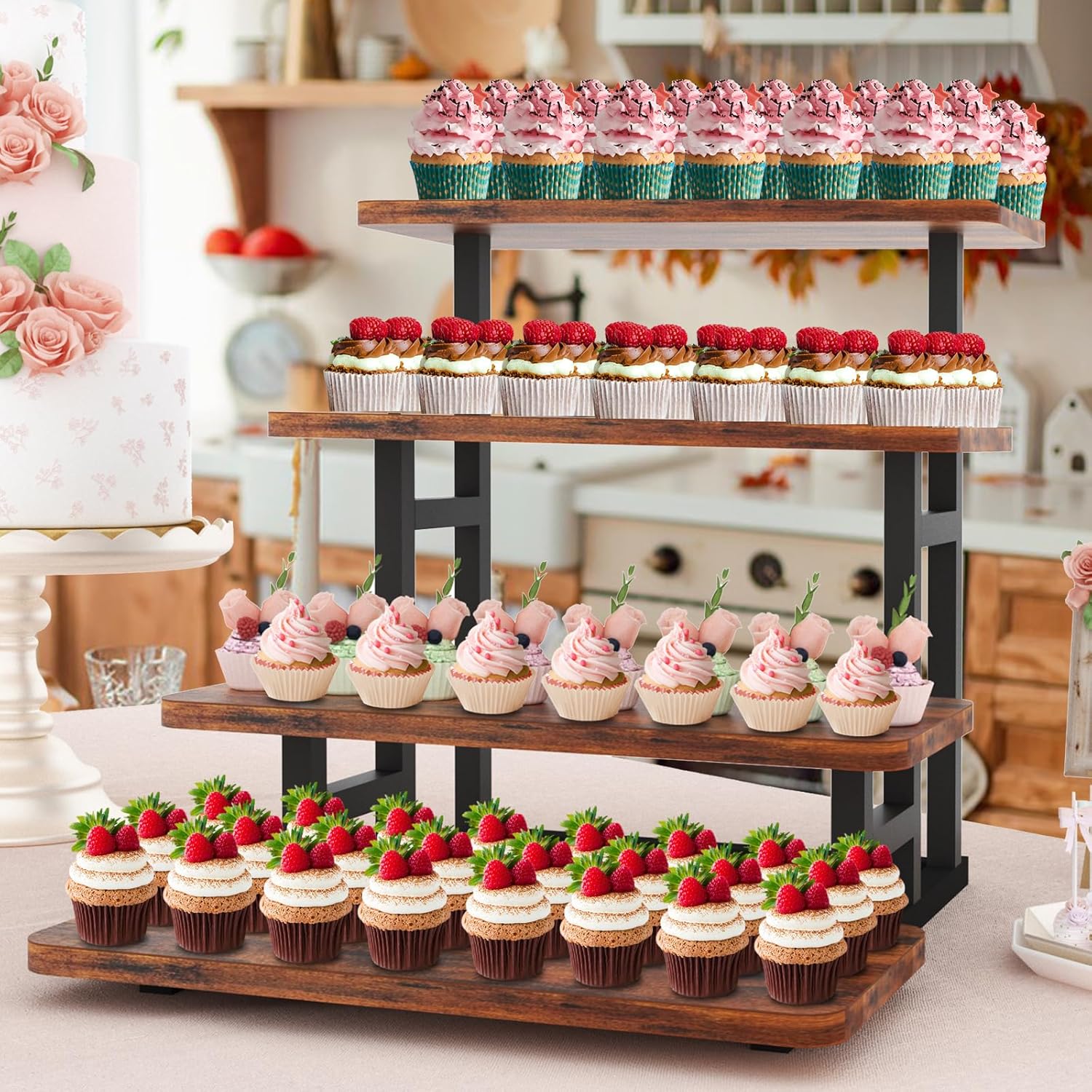 Cupcake Stand for 50 Cupcakes, 4 Tier Wooden Risers Display Stands Stepped Dessert Table Display Set with Metal Frame Tiered Tray Stand Serving Trays for Party Farmers Market Display