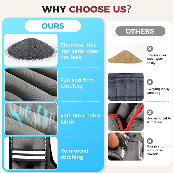 - Superior Performance: Our weighted vest features upgraded iron sand with even weight distribution, maximizing workout efficiency and minimizing injury risks. Reinforced double-stitched seams prevent sand leakage, ensuring a secure and durable experience for safe, effective training