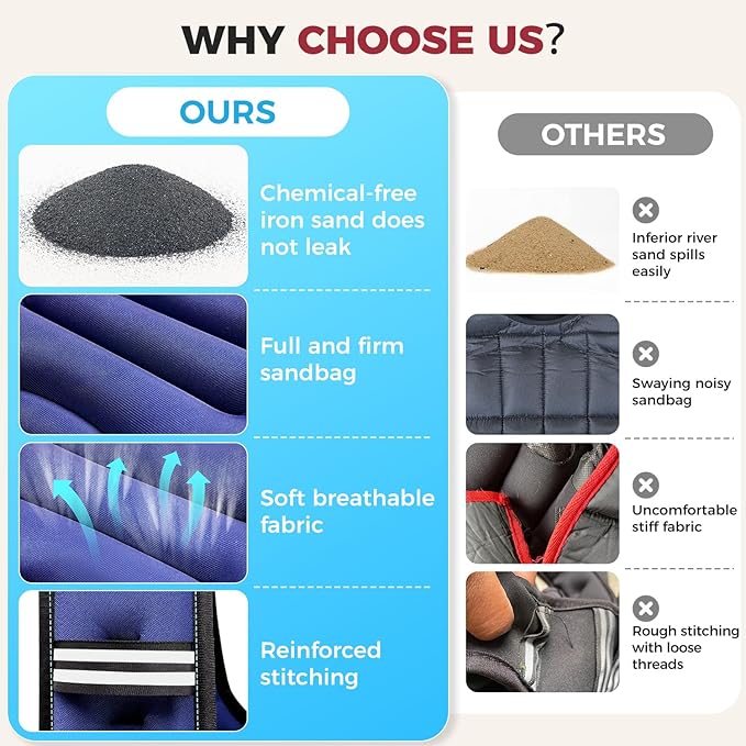 - Superior Performance: Our weighted vest features upgraded iron sand with even weight distribution, maximizing workout efficiency and minimizing injury risks. Reinforced double-stitched seams prevent sand leakage, ensuring a secure and durable experience for safe, effective training