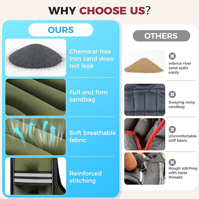 - Superior Performance: Our weighted vest features upgraded iron sand with even weight distribution, maximizing workout efficiency and minimizing injury risks. Reinforced double-stitched seams prevent sand leakage, ensuring a secure and durable experience for safe, effective training