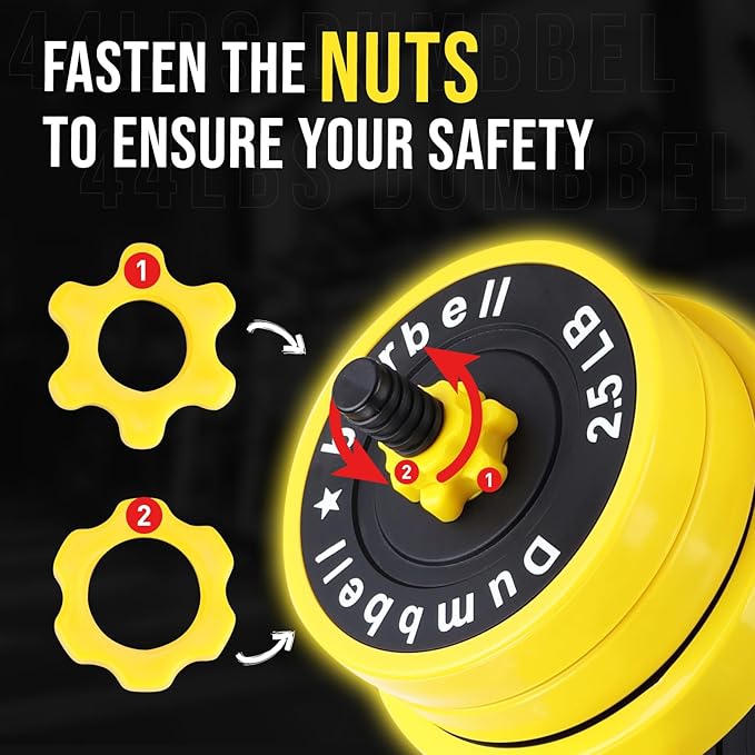 - DOUBLE LOCK TO ENSURE YOUR SAFETY: There are 2 kind of fixed nuts to ensure your safety. Just assemble the dumbbell plate with 2 nuts and you can get different weights to start your exercise.