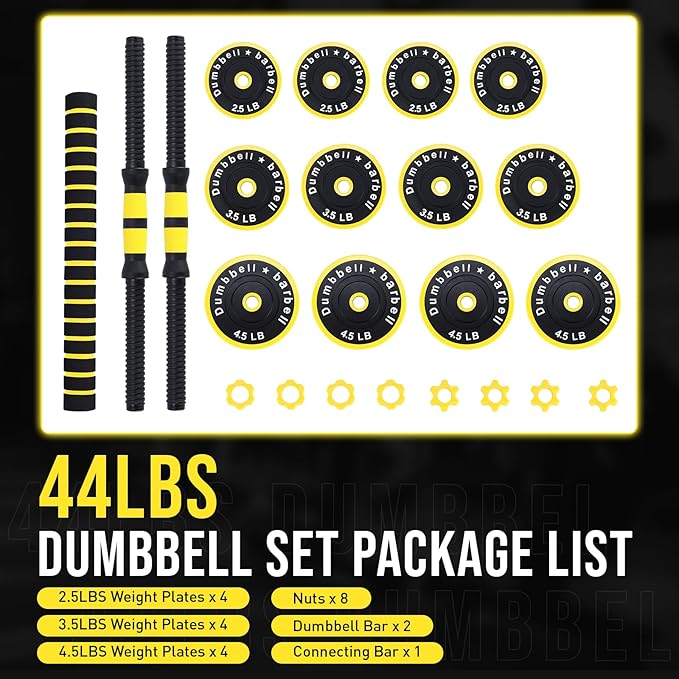 - 44 LB PACKAGE INCLUDED: 4 x 4.5 LB Dumbbell Weight Plate, 4 x 3.5 LB Dumbbell Weight Plate, 4 x 2.5 LB Dumbbell Weight Plate, 2 x Dumbbell Bars, 1 x Connecting Bar, 8 x Nuts.