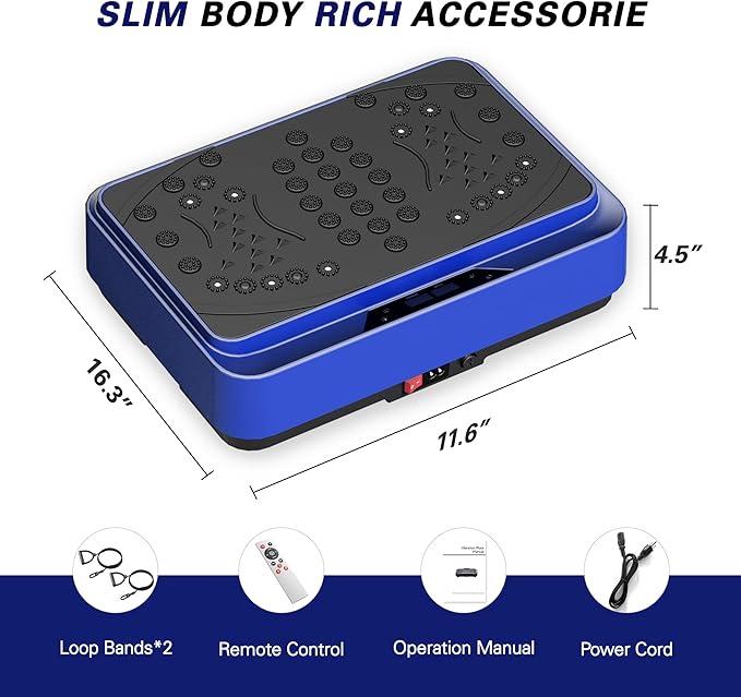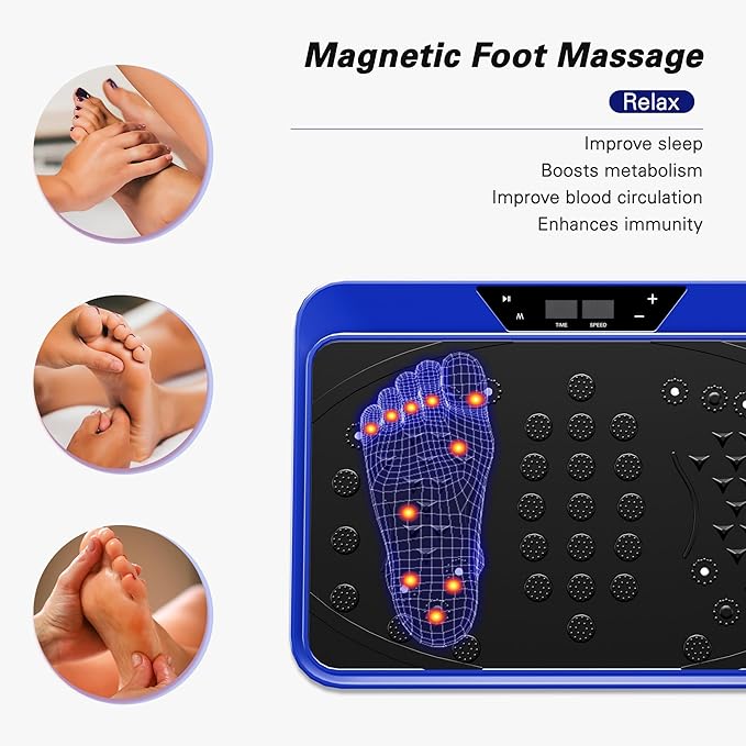 - 【Vibration plate with unique finger pressure surface】This full body vibration board exercise machine is equipped with a unique customized foot massage stone.When we use a weight loss vibration board,it can stimulate pressure points on our feet,massage our soles,and help relieve back pain,headaches,insomnia,poor blood circulation,muscle and joint pain,stress,and anxiety.