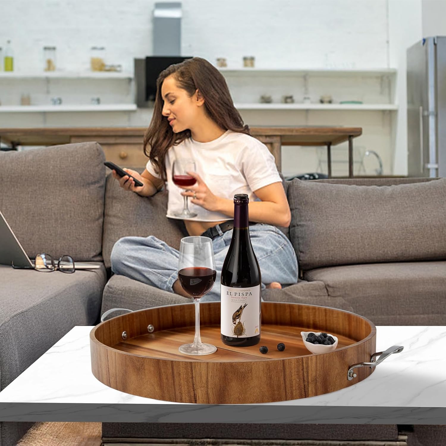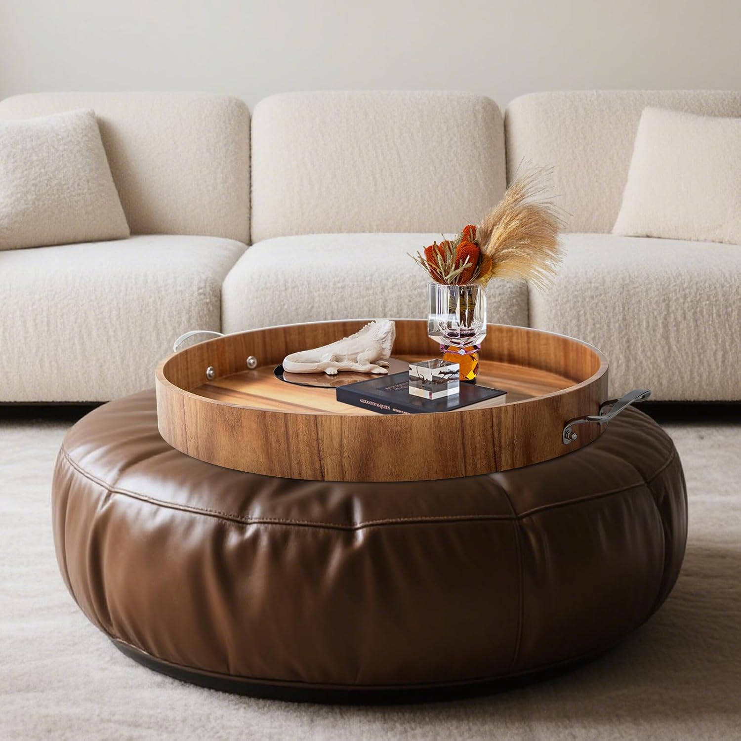 Ottoman Tray with Handles, 20 Inch Round Ottoman Tray Large Trays for Ottomans Wooden Serving Tray Decorative Trays for Living Room, Party, Breakfast, Drinks, Snacks, Appetizers