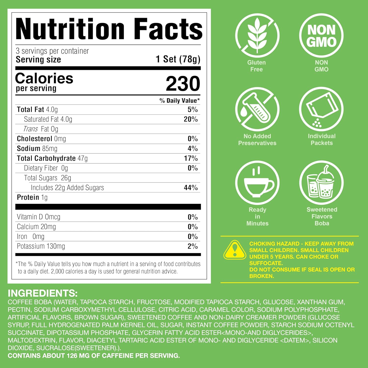 - WHAT IS INSIDE - 3 Individually wrapped portions of Brown Sugar boba, 3 vietnamese coffee packets, & 3 extra wide paper straws. Store in a cool, dry place (no refrigeration necessary).