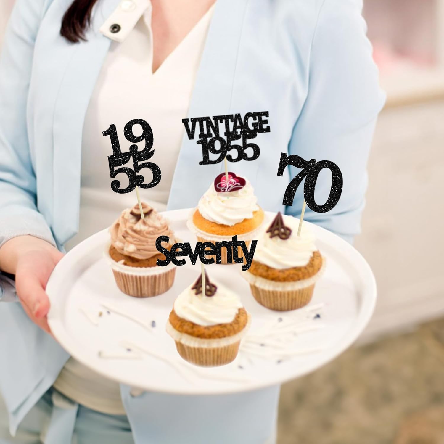 Gyufise 24Pcs Vintage 1955 Cupcake Toppers Glitter Cheers to 70 Fabulous Seventy Cupcake Picks 70th Birthday Wedding Anniversary Party Cake Decorations Supplies Black