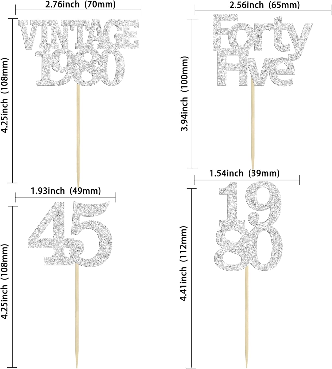 Gyufise 24Pcs 45th Birthday Cupcake Toppers Glitter Cheers to 45 Fabulous Forty Five Vintage 1980 Cupcake Picks 45th Birthday Wedding Anniversary Party Cake Decorations Supplies Silver