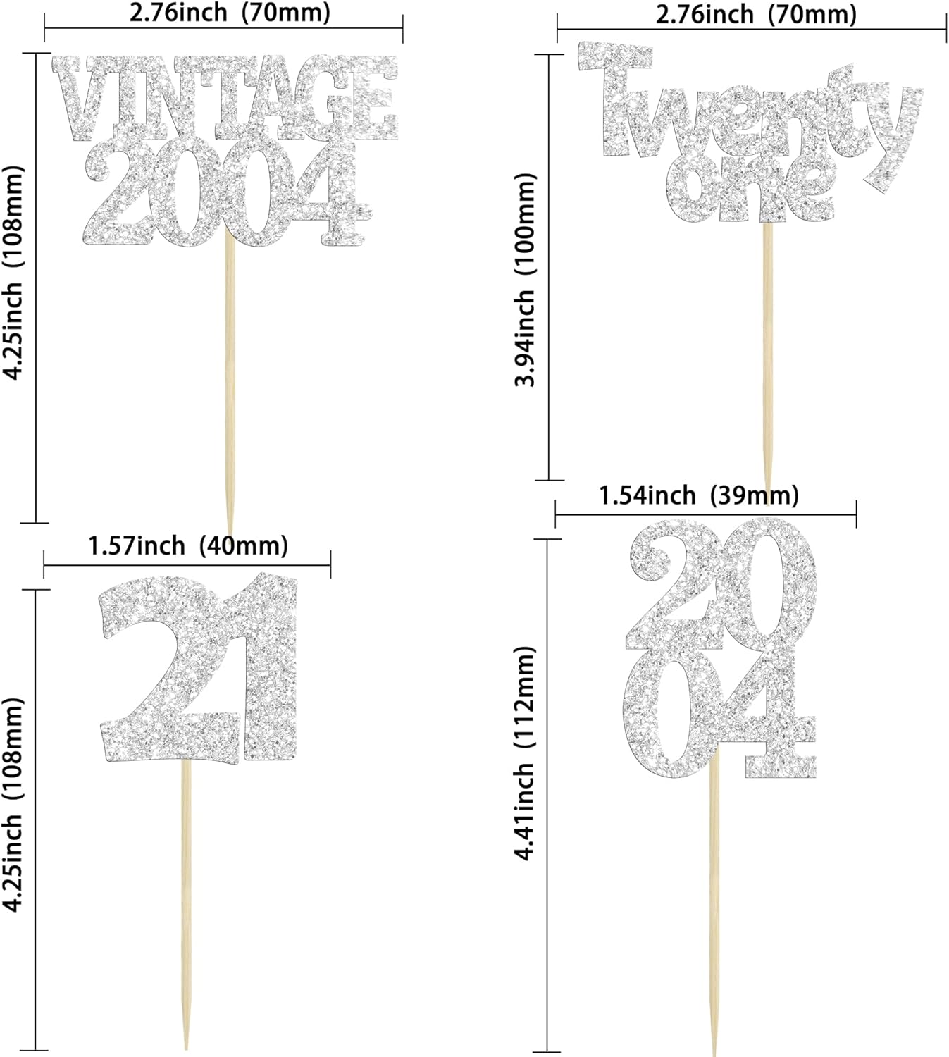 Gyufise 24Pcs 21st Birthday Cupcake Toppers Glitter Twenty-one Vintage 2004 Hello 21 Years Birthday Cupcake Picks Cheers to 21 Cake Decor for Happy 21st Anniversary Party Supplies Silver