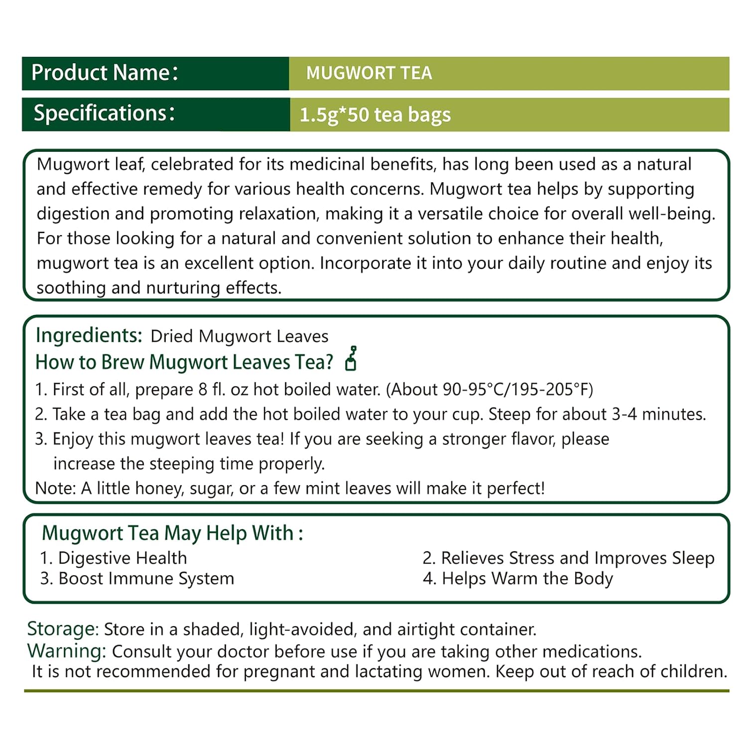 - [Support Immune Health]: Mugwort tea is gentle and beneficial for all ages, rich in minerals and vitamins. It helps relax the body and is traditionally enjoyed as a comforting tea for women during their cycle, providing soothing support for overall well-being.