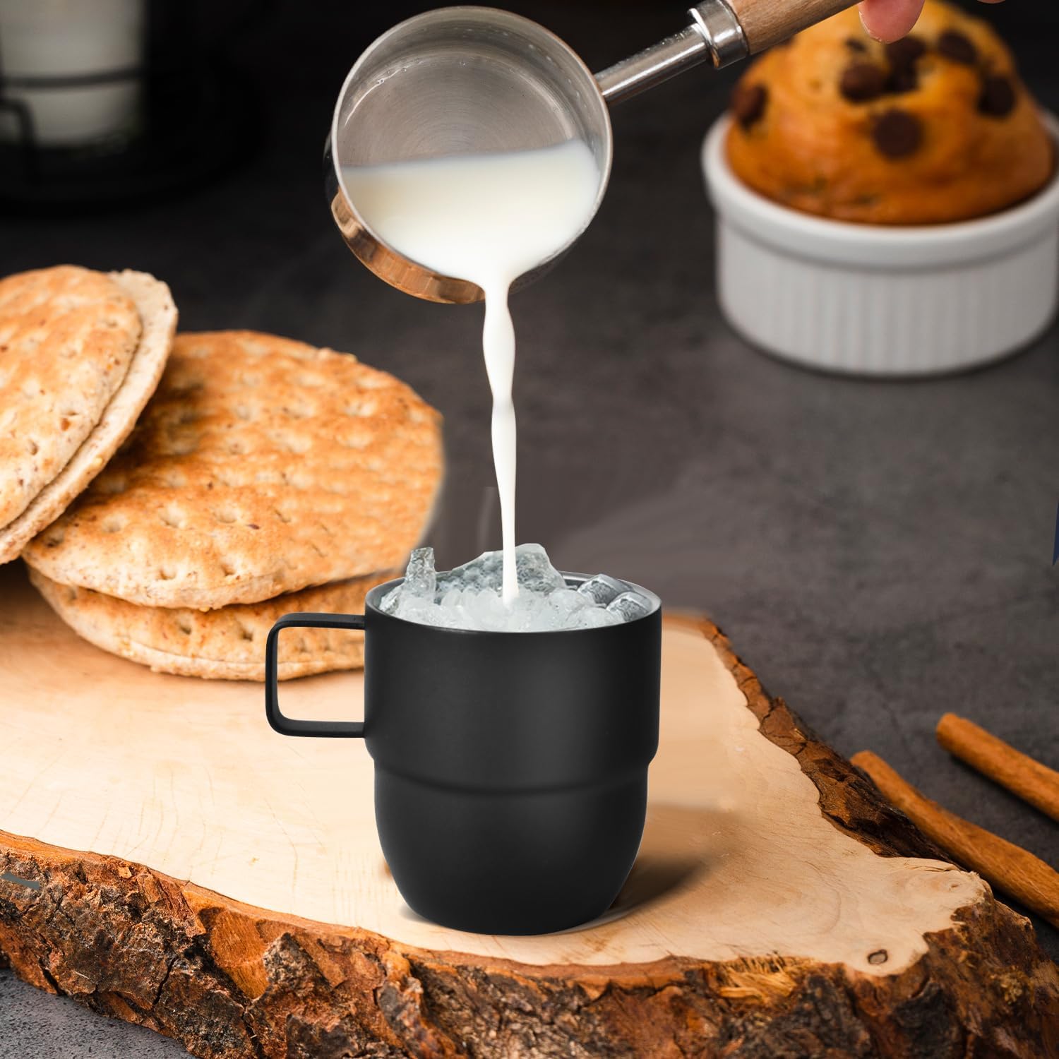 - DOUBLE WALL STAINLESS STEEL: Our espresso cups are made from double wall 18/8 stainless steel, vacuum insulated. Compared to ceramic lining, stainless steel lining are more durable, anti-scald, odourless, not break easily, and better at retaining hot or cold. Whether it's a hot coffee or an iced coke, this small cup is up to the task!(Please Note: Due to the small size of the cups for easy carrying, the hot/cold effect lasts approximately 3-4 hours.)