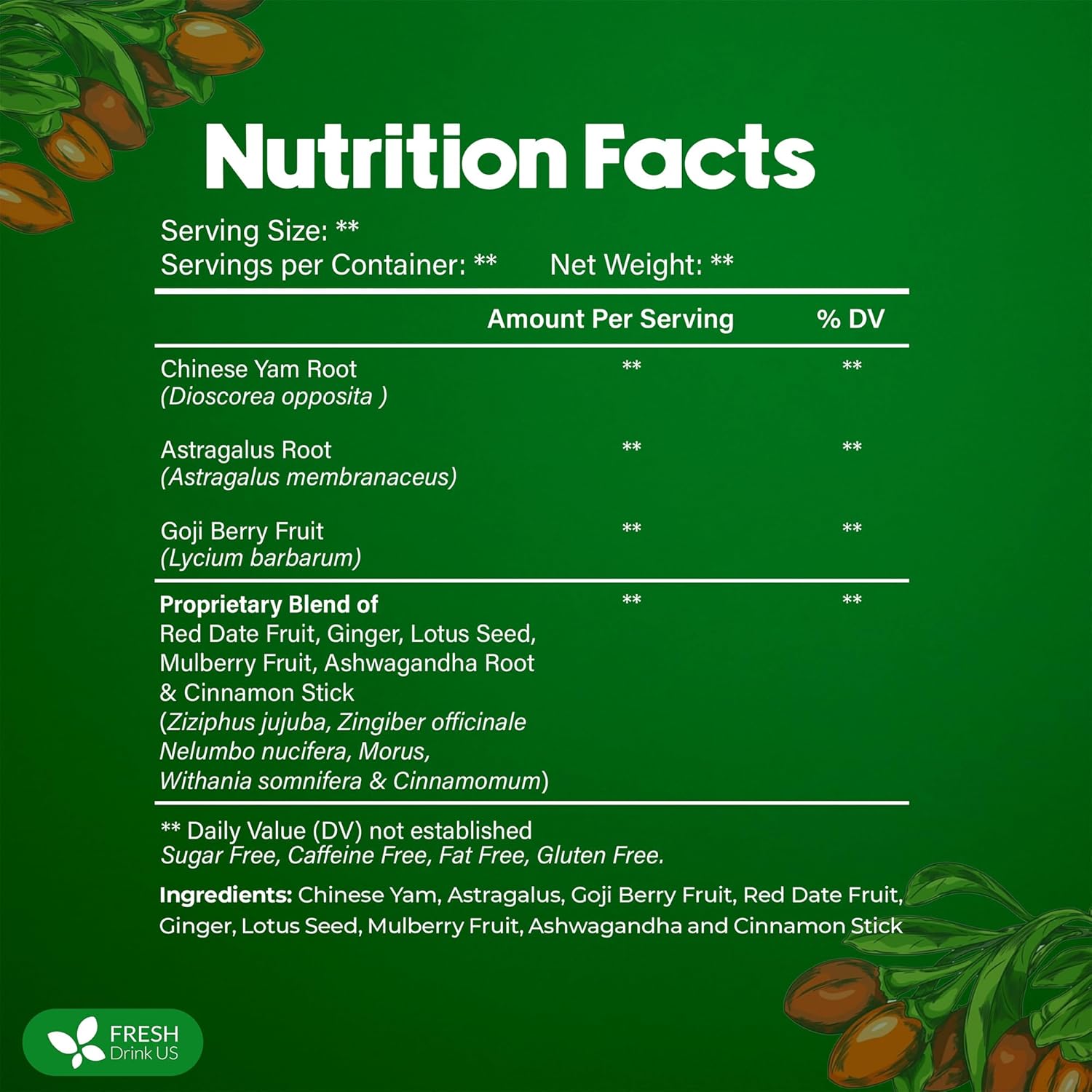 - ☘️ 100% NATURAL INGREDIENTS: Chinese Yam Root, Astragalus Root, Goji Berry Fruit, Red Date Fruit, Ginger, Lotus Seed, Mulberry Fruit, Ashwagandha Root, Cinnamon Stick. We source the finest natural herbs to create our tea, made without additives or artificial flavors, ensuring you receive a pure and authentic taste.