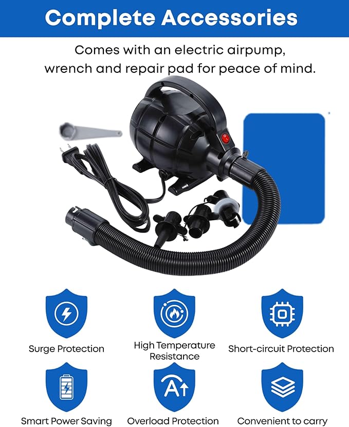- ⭐【COMPLETE KIT, LIFETIME SUPPORT】Includes electric pump + repair patches. Fix punctures in minutes and enjoy lifelong durability. (Backed by a 1-year warranty!)