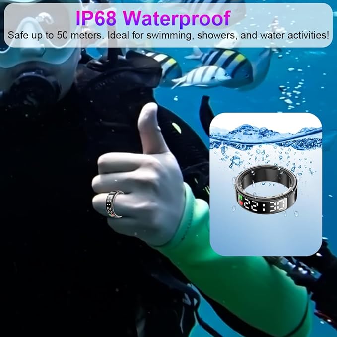 - 【Lightweight & Compact Fitness Tracker with IP68 Waterproof Durability】 Weighing only 3.5g, this smart ring is ultra-light and comfortable for all-day wear. It’s also IP68 waterproof, making it perfect for swimming, running in the rain, or intense workouts without worrying about water damage. Whether you're in the pool or caught in a downpour, this durable ring ensures reliable performance, helping you track your health and fitness in any condition.