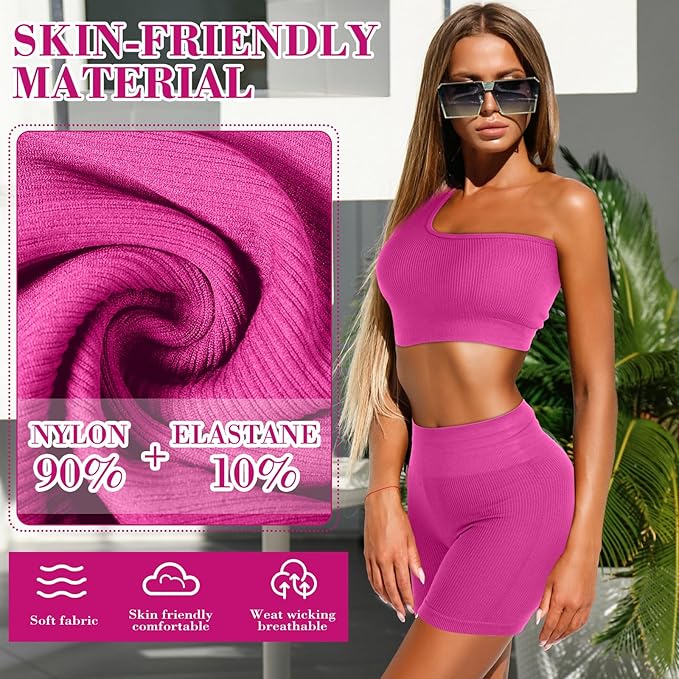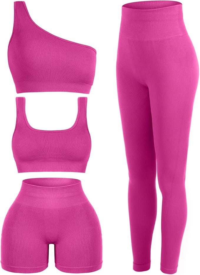 - Pilates Outfit Set: women 4 piece workout sets include 1pcs scoop neck sports bra, 1pcs one shoulder sport top, 1pcs ribbed shorts and 1pcs women leggings, stylish and practical garments designed to bring comfort and functionality to your workouts