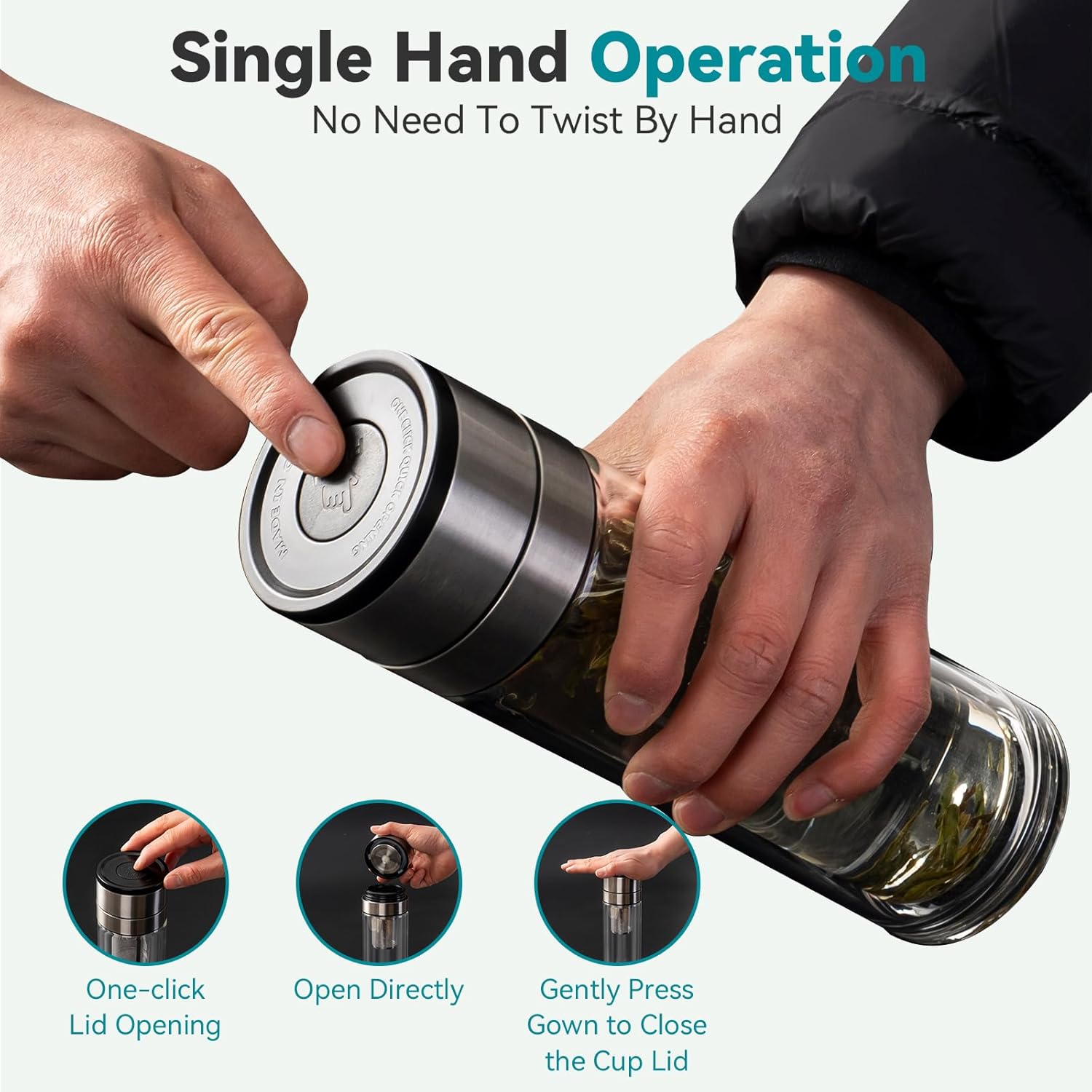 - Effortless One-Touch Lid: The innovative one-touch open lid on this tea infuser bottle allows you to open the bottle with just a press—no twisting or turning needed. Simply press down to close for a secure, leakproof seal, making it perfect for busy mornings or on-the-go use.