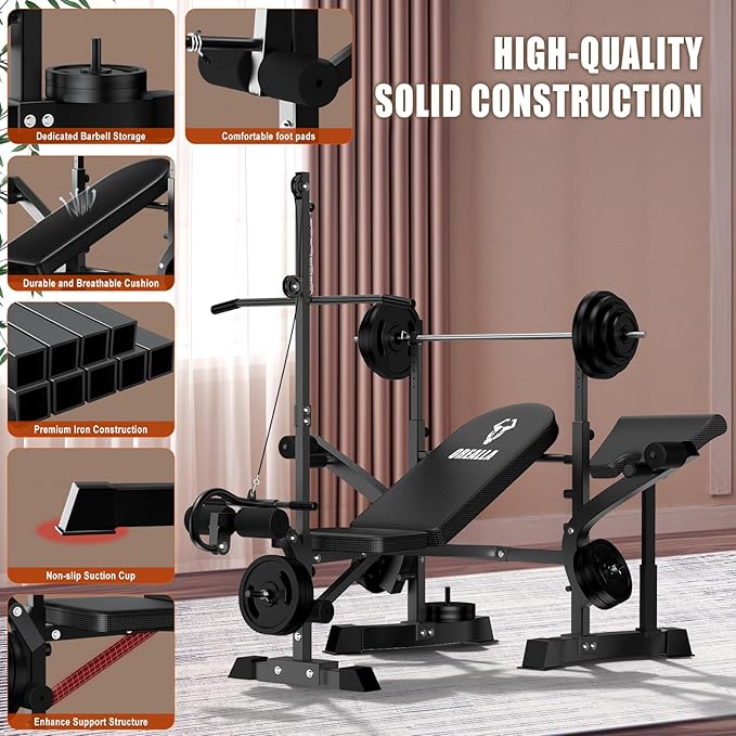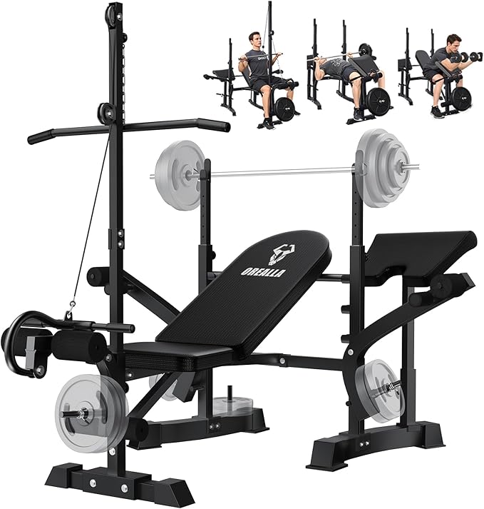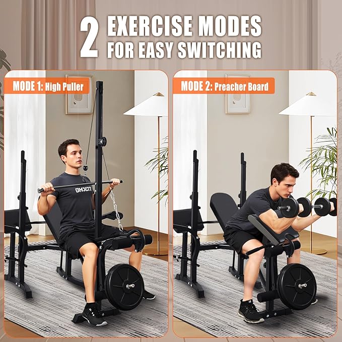 - New Dual-Mode Olympic Weight Bench: Combines a removable preacher curl pad for targeted arm training and a cable pulley system for full-body strength exercises. This 2-in-1 design meets diverse training needs. Easily switch between modes for bicep curls, chest presses, and more. Includes a dedicated barbell rack and storage space for barbells and dumbbells. Ideal for versatile fitness routines. (Note: Barbell And Weights Are Not Included)
