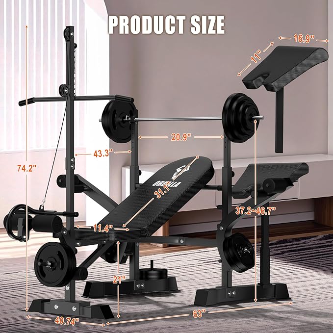 - Adjustable Weight Bench Set: Features 4 backrest positions (flat, incline, decline) for versatile full-body workouts targeting the chest, shoulders, back, and legs. Includes a 4-position preacher curl pad with soft cushioning for comfortable bicep and core exercises. The 7-level adjustable barbell rack supports bench presses, deadlifts, shoulder presses, and more, accommodating users of all heights. Its durable and stable design ensures proper form and reduces the risk of injury