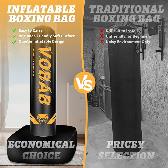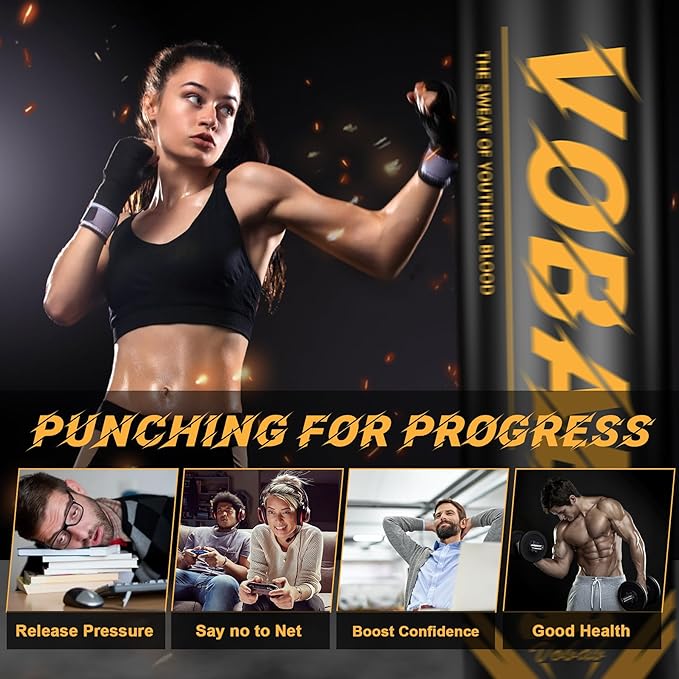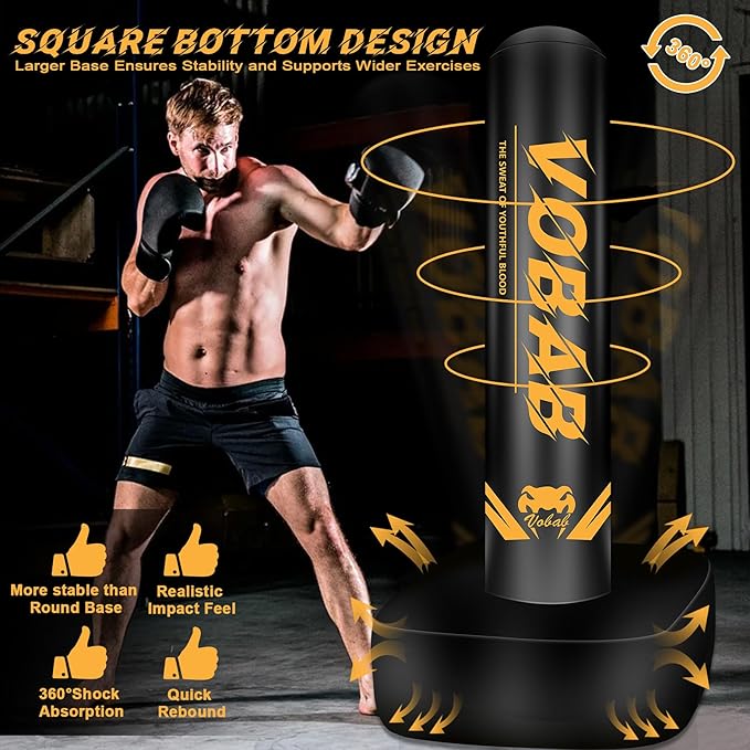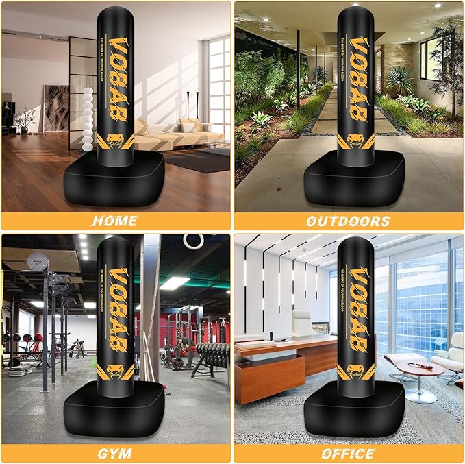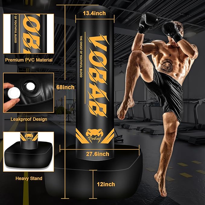 - Premium Boxing Training Punching Bag: After strict factory inspection, Vobab brand punching bags are guaranteed to be in mint condition, making your workout experience seamless; This 70-inch tall punching bag is suitable for both teenagers and adults; It is made of high-grade PVC material, which enhances the durability of the punching bag (Boxing gloves and pump not included)