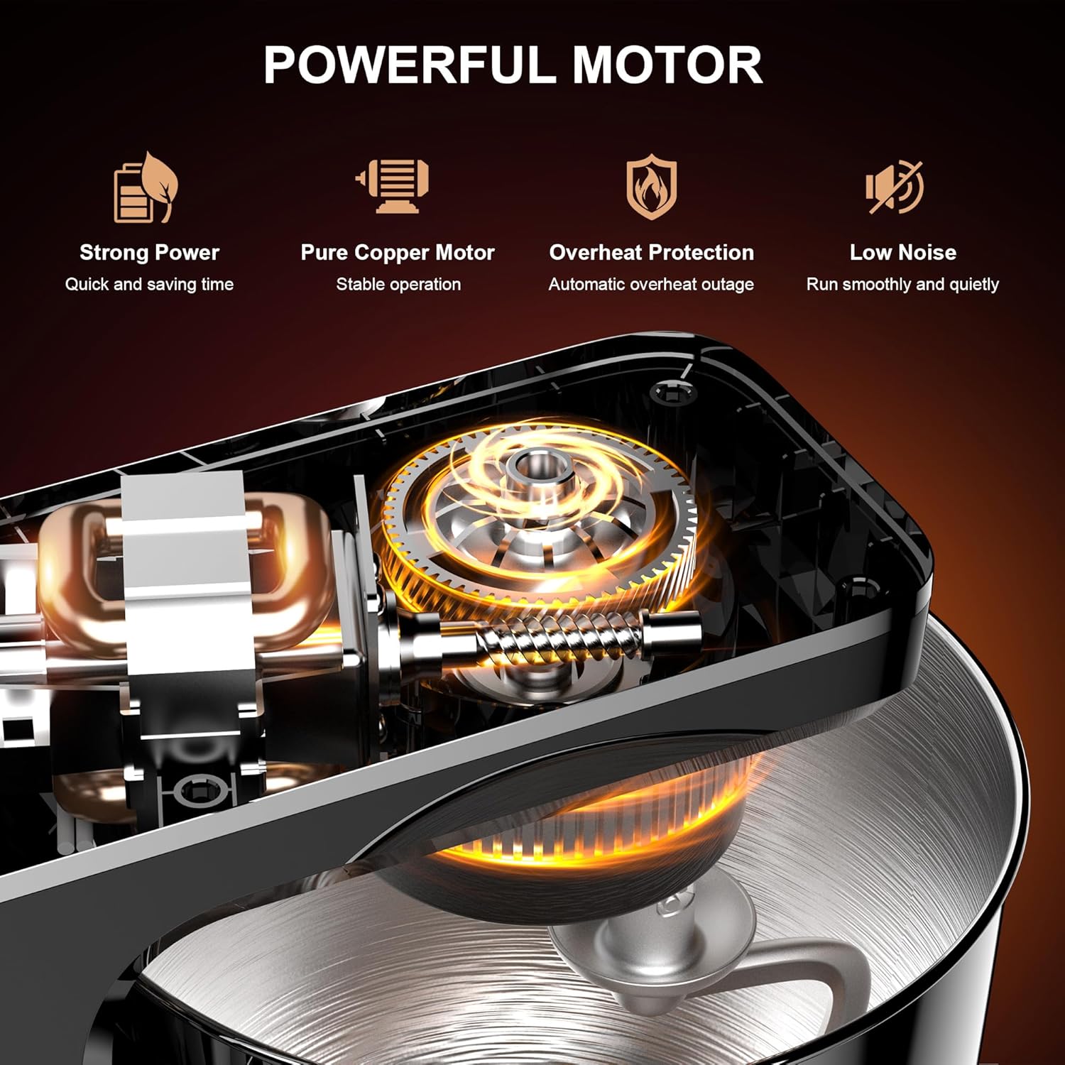 - Versatile Attachments Included: Our baking mixer comes with a dough hook, whisk, beater and a silicone spatula, enabling you to tackle a variety of recipes, from heavy dough to light meringues, ensuring professional-quality results every time