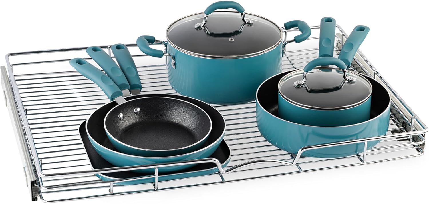 - HIGH QUALITY: Made of durable metal with chrome finish the pull out shelf for kitchen cabinet is simple and easy to install. Designed to fit any style of cabinetry and easy to clean.
