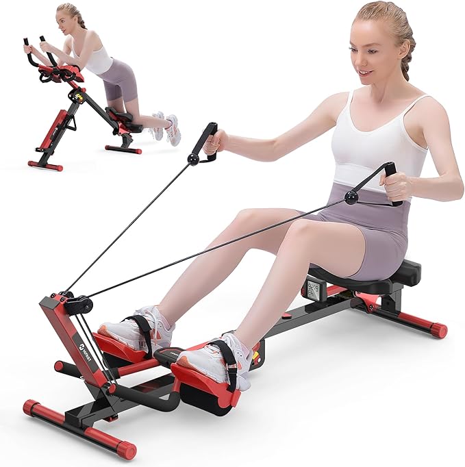 Rowing Machine, 4 in 1 Rowing and Ab Machine with 2 Levels of Workout Resistance, Quiet & Foldable Rower Machine with 3 Adjustable Handle Heights & LCD Monitor, Row Machine for Home Exercise