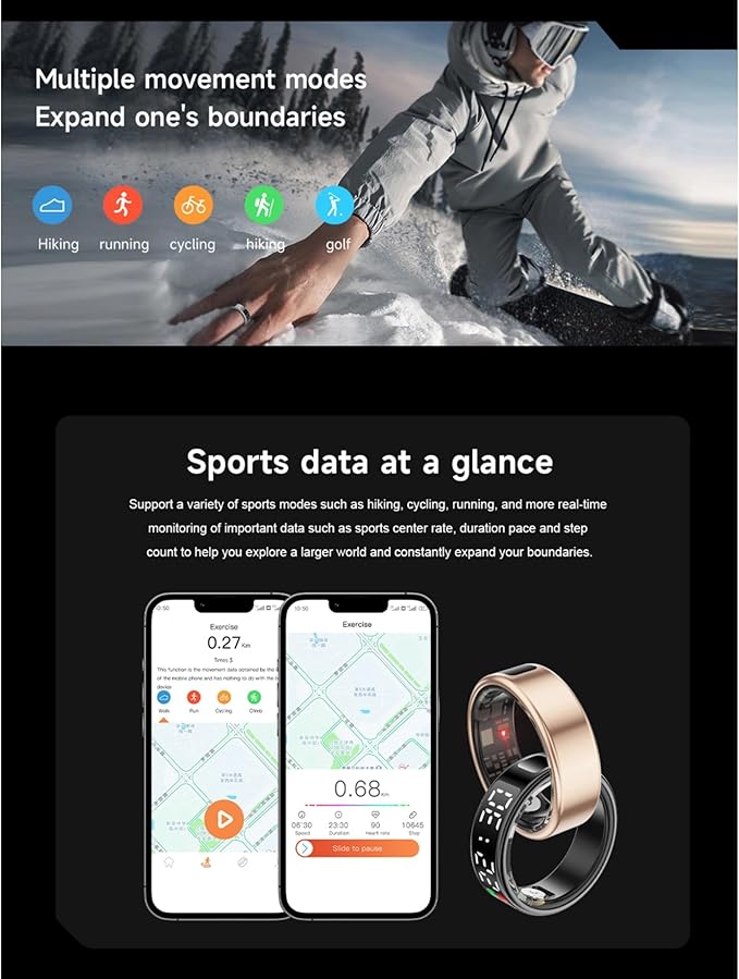 - [Multiple Sports Modes] The smart ring supports various sports modes like climbing, cycling, running, providing real time monitoring of exercise duration and steps.