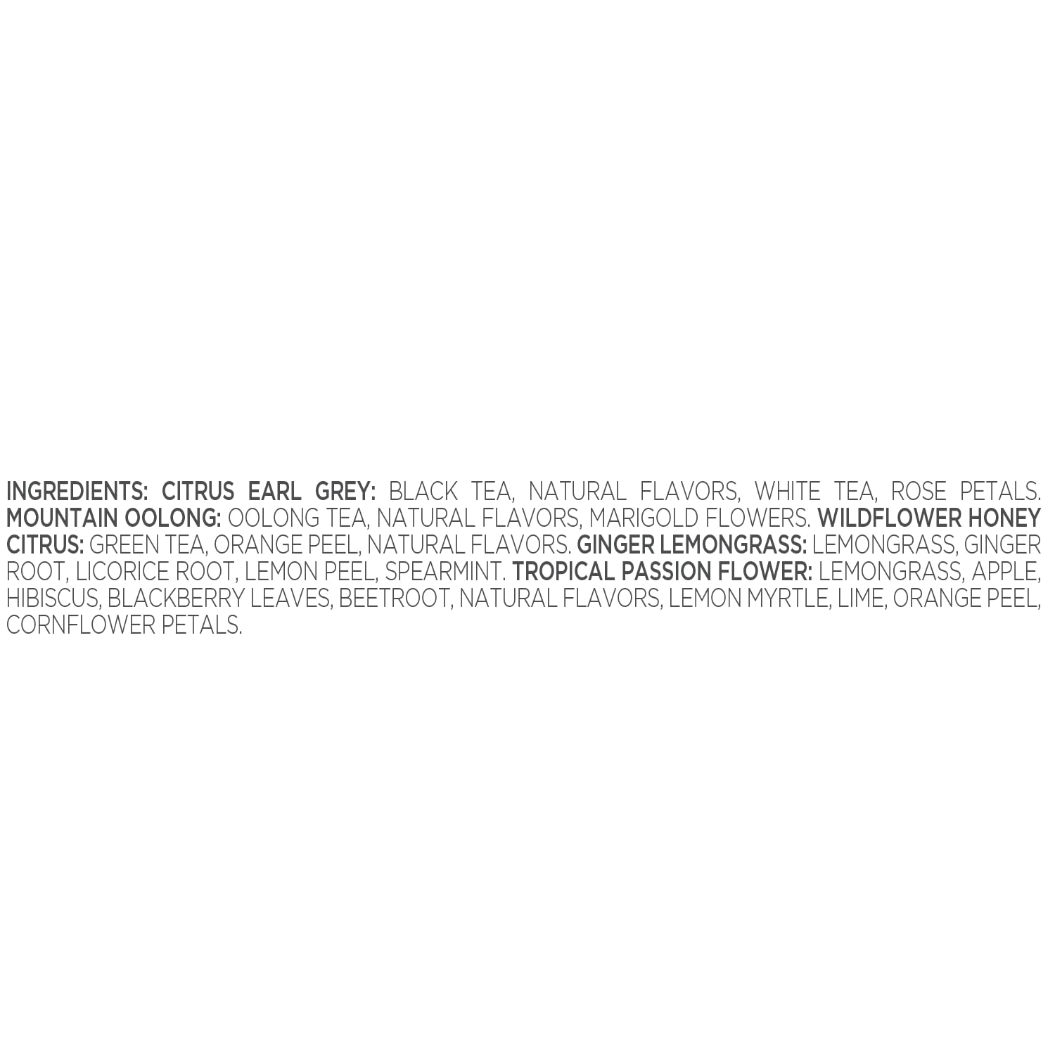 - TEA BLENDS - In this collection are crafted to evoke a sense of tropical tranquility and include: Citrus Earl Grey (Black tea), Mountain Oolong (Oolong Tea), Wildflower Honey Citrus (Green tea), Ginger Lemongrass (Herbal tea), and Tropical Passion Flower (Herbal Tea).