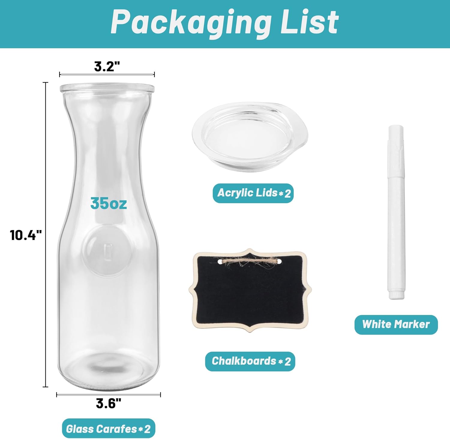 Glass Carafe with Acrylic Lid,35 Oz Beverage Dispensers Carafe,Mimosa Bar Supplies,Clear Glass Pitcher with Name Labels for Iced Tea,Coffee,Juice(Set of 2)