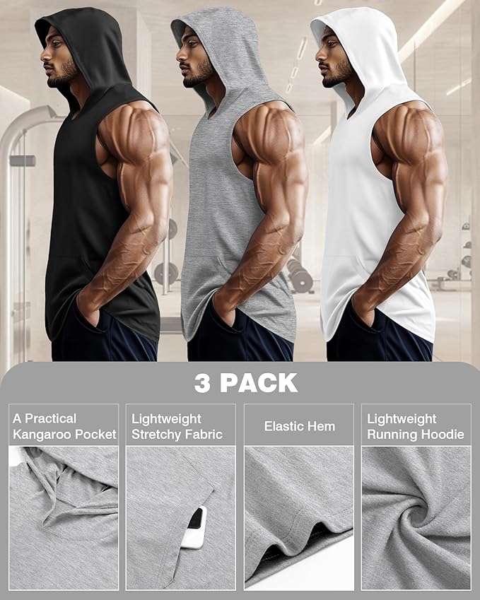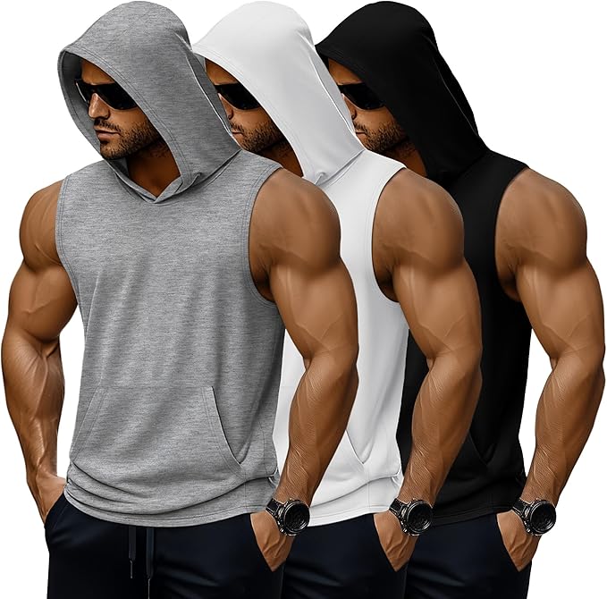 3 Pack Men's Big & Tall Workout Hooded Tank Tops, Cotton Sleeveless Gym Hoodies Bodybuilding Muscle Cut Off Shirts