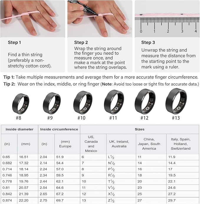 - 【Smart Ring for Everyone】The smart ring suitable for both men and women, combines health tracking, fitness monitoring, blood pressure, and sleep analysis in a sleek design. It continuously tracks heart rate, blood oxygen levels, daily activities, and sleep patterns for a real-time health overview. As a fitness companion, it accurately logs steps, calories burned, and distance traveled, helping you manage your wellness effectively.