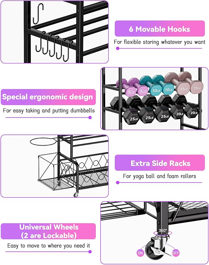 - Large Capacity and Unique Design: This yoga storage rack features a large capacity design. It has 2 dumbbell rack layers with an ergonomic design for easy access and placement. It also features extra side racks for yoga ball and foam rollers, and comes with 6 removable hooks for hanging your sports equipment like jump ropes and resistance bands, making it perfect for organizing your home gym.