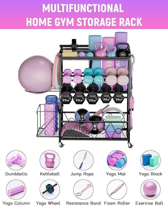 Home Gym Organizer All-in-One Yoga Dumbbell Rack Kettlebell Sets Holder, for Workout Exercise Equipment, Yoga Mat, Fitness Accessories, Home Gym Equipment Storage with Wheels