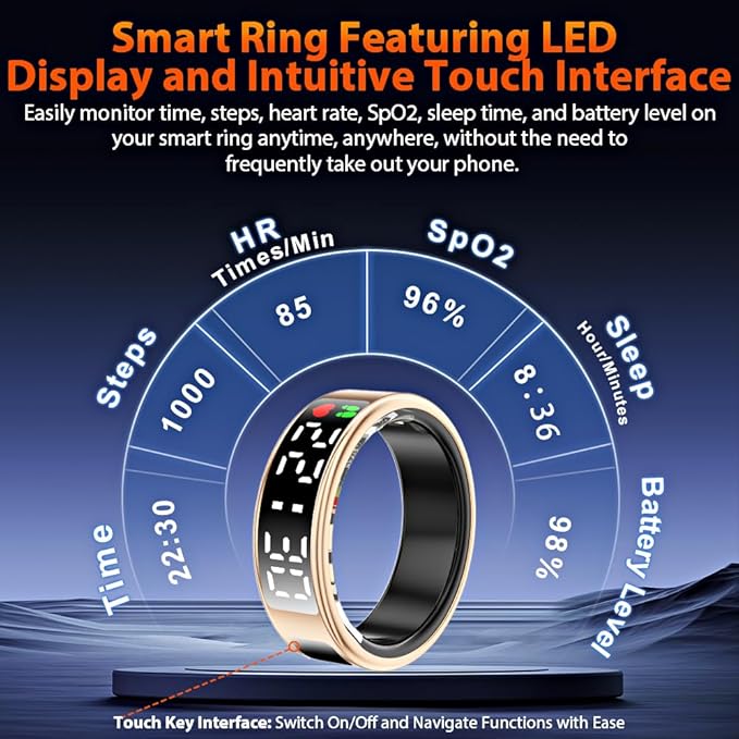 - 2025 Upgraded Smart Ring with LED Screen & Touch Button: Experience seamless device management with a high-definition LED screen and intuitive touch control. With a simple tap, you can effortlessly monitor essential data such as time, step count, heart rate, blood oxygen, sleep, and battery—without needing to constantly take out your phone. Designed for ultimate convenience, our smart ring is perfect for work, fitness, and leisure, adding a modern, stylish edge to your daily digital experience.