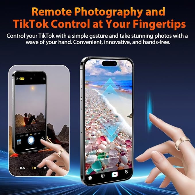 - Fashion Smart Ring with Gesture Control for Apps: Enjoy easy control with air gesture functionality. Simply wear the ring and use gestures to browse TikTok, scroll through videos, flip pages in e-books, shop online, browse websites, or capture photos, providing hands-free convenience in daily tasks.