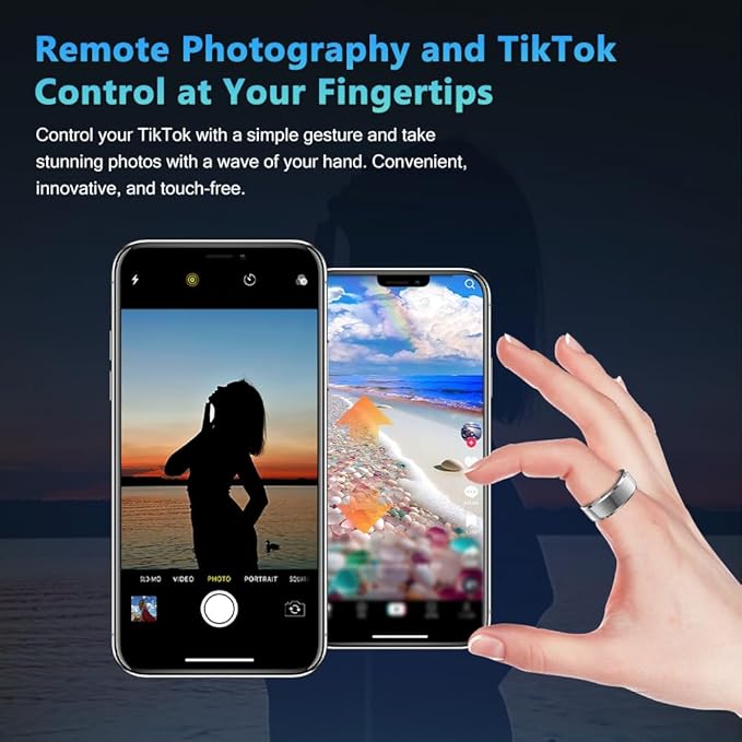 - Fashion Smart Ring with Gesture Control & Easy to Charge and Carry: Enjoy effortless control with air gesture functionality. Simply wear the ring and use gestures to browse TikTok, scroll through videos, flip pages in e-books, or capture photos, providing hands-free convenience for daily tasks. The included sleek 300mAh charging case not only ensures quick and easy recharging but also serves as a convenient storage solution, making it easy to carry your smart ring wherever you go.