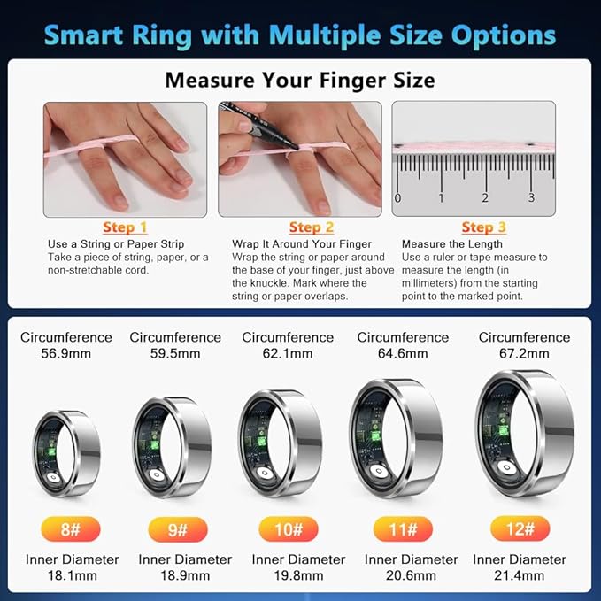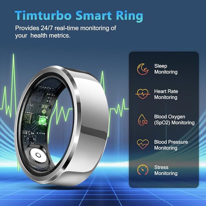 - 24/7 Comprehensive Health Monitoring with Our Health Ring: Monitor your health metrics with the built-in sensors, including heart rate, blood oxygen, blood pressure, sleep patterns with deep sleep, light sleep & wake-up time, and stress in real-time with our all-in-one smart ring. It features a dedicated women’s health section for personalized insights, empowering you to stay on top of your well-being each day. This smart ring health tracker helps you live a healthier, more active life.