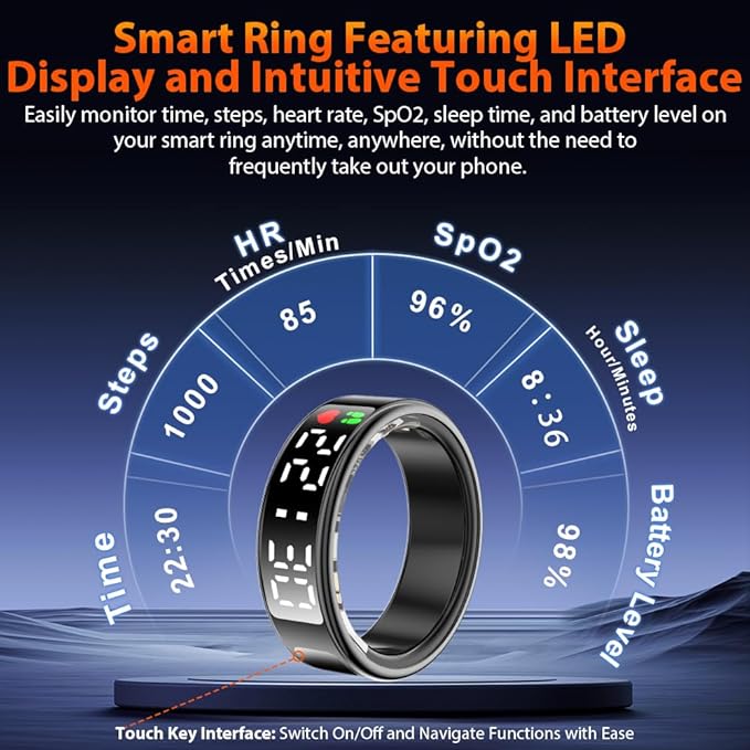 - 2025 Upgraded Smart Ring with LED Screen & Touch Button: Experience seamless device management with a high-definition LED screen and intuitive touch control. With a simple tap, you can effortlessly monitor essential data such as time, step count, heart rate, blood oxygen, sleep, and battery—without needing to constantly take out your phone. Designed for ultimate convenience, our smart ring is perfect for work, fitness, and leisure, adding a modern, stylish edge to your daily digital experience.