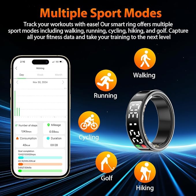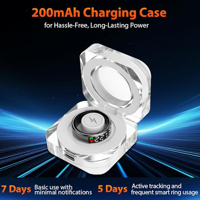 - 2025 Upgraded Smart Ring with LED Screen & Touch Button: Experience seamless device management with a high-definition LED screen and intuitive touch control. With a simple tap, you can effortlessly monitor essential data such as time, step count, heart rate, blood oxygen, sleep, and battery—without needing to constantly take out your phone. Designed for ultimate convenience, our smart ring is perfect for work, fitness, and leisure, adding a modern, stylish edge to your daily digital experience.