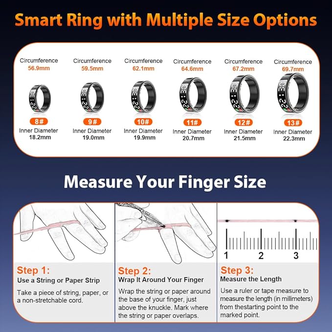 - Simple to Use with No Subscription Fees: Easily connect your smart ring to iOS 10.0+ or Android 5.0+ devices via Bluetooth for seamless data tracking and app control. No subscription fees required. Once synced, you can conveniently manage and view your data directly from your smartphone.