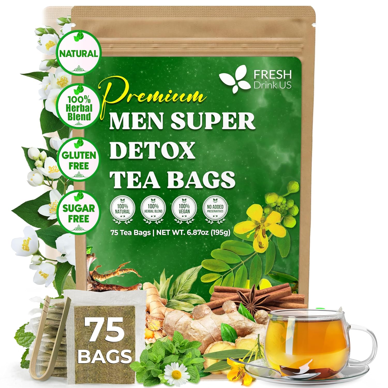 FreshDrinkUS, Premium 75 Tea Bags Men Super Detox Tea – Herbal Blend with Senna, Dandelion Root, Ginger, Peppermint & More – 100% Natural, Sugar-Free. Caffeine-Free. Gluten-Free. Vegan