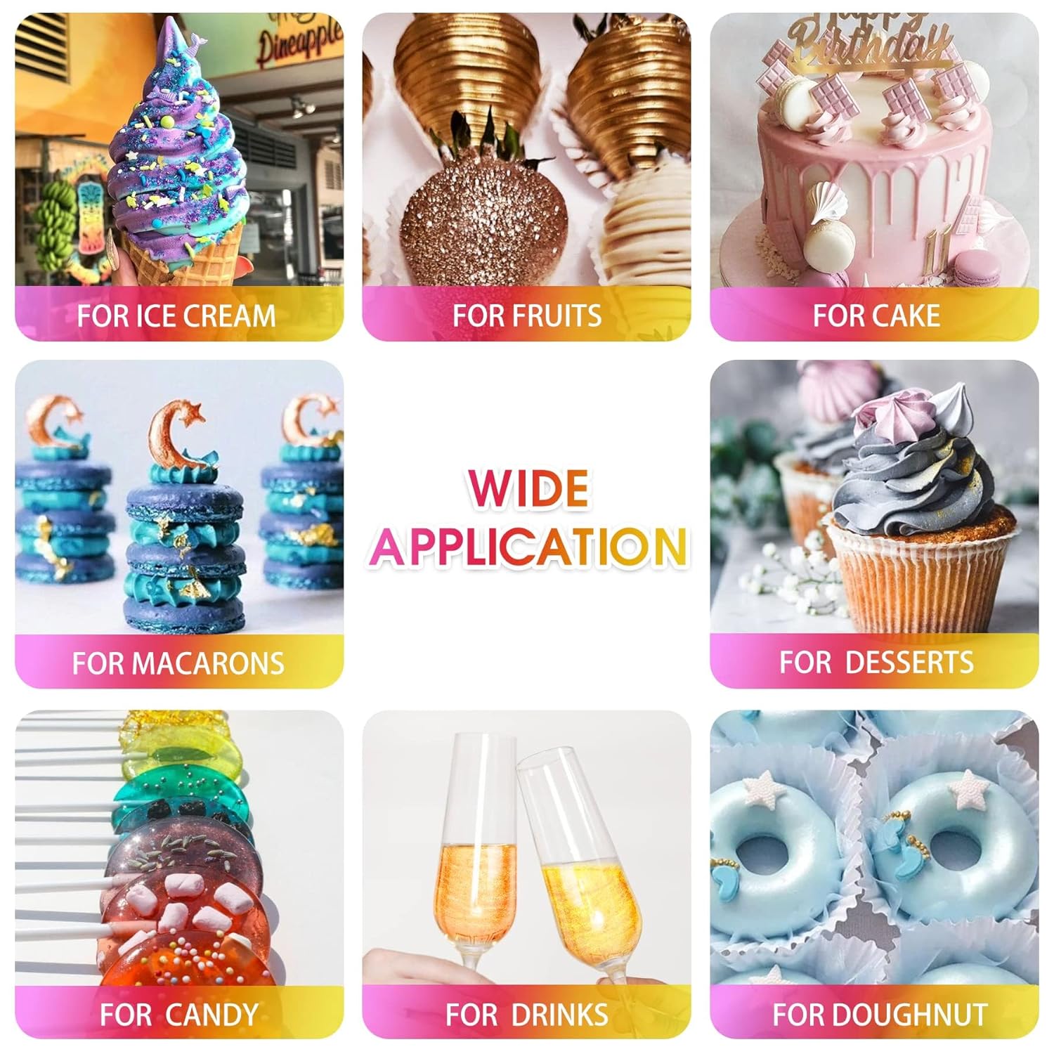 - SAFE & PREMIUM - Made from food grade ingredients, this luster dust is not only safe but also free from fat, GMOs, gluten, dairy, and nuts. It is sugar free and flavorless, providing vibrant metallic effects for all types of applications without altering the taste or texture.