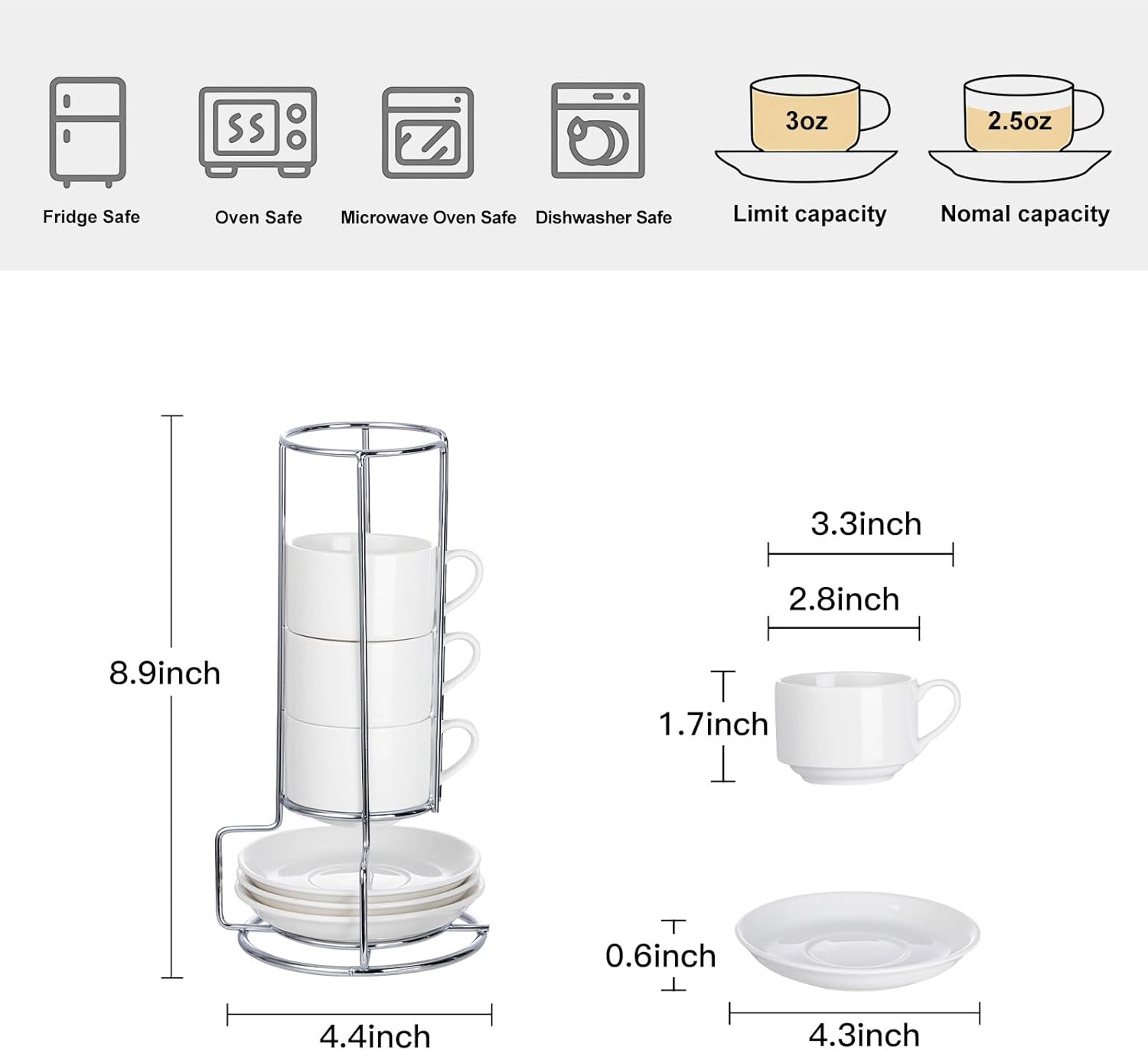 2.5 Ounce Porcelain Espresso Cups with Saucers and Silver Stand, White Stackable Cups Set of 4