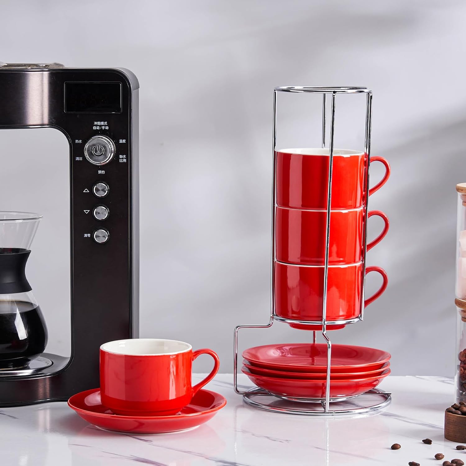 - The cups and saucers can be stacked neatly on the metal stand for easy organization, keeping your coffee corner clean and tidy. Say goodbye to clutter and embrace the simplicity of an organized life.