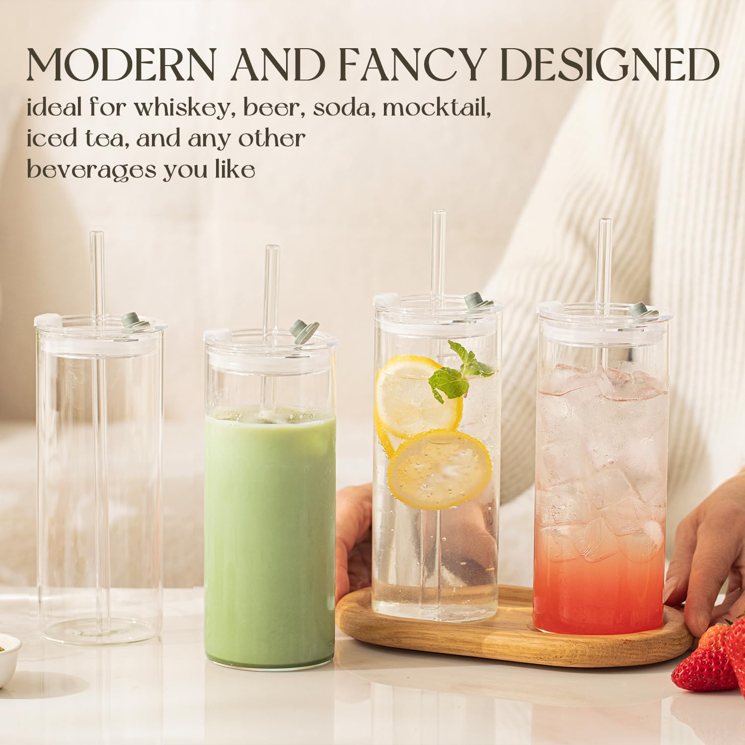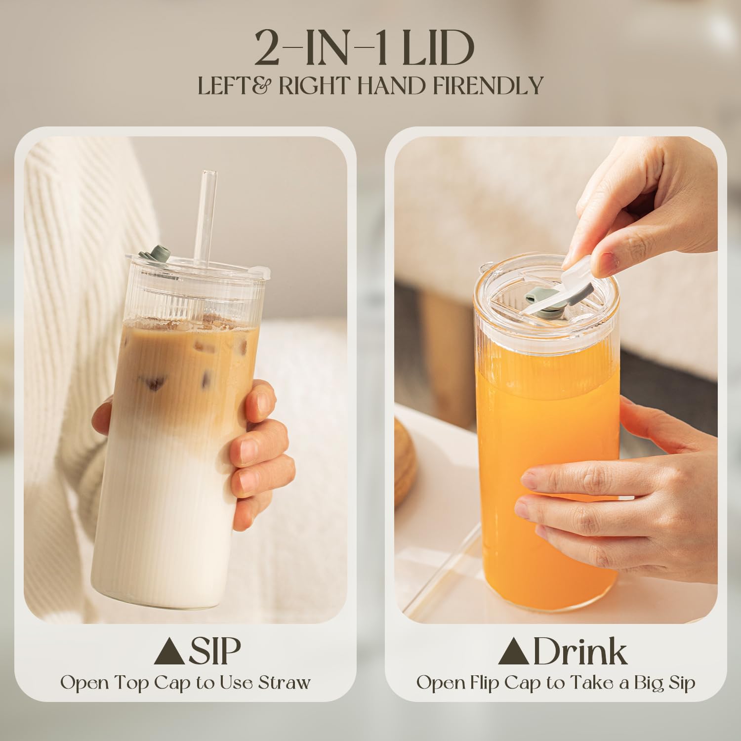- 【Perfect for Iced Coffee & Bubble Tea】 These 18oz glass cups with straws are ideal for enjoying iced coffee, boba tea, smoothies, and cold brews. The wide opening accommodates boba pearls and ice cubes, while the reusable straws make every sip effortless.