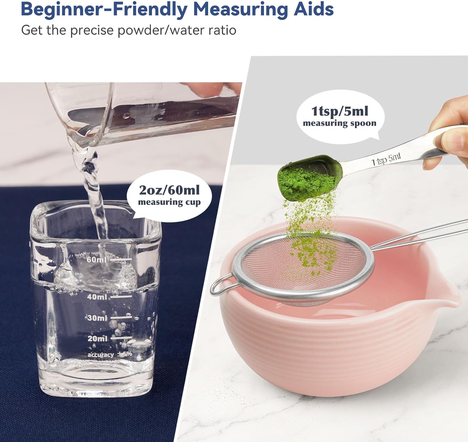 - Beginner-Friendly Measuring Aids: The matcha starter set contains a stainless steel measuring spoon (1tsp/2g) and measuring glass (2oz/60ml) to help you easily get the precise powder/water ratio whether when making standard matcha flavor or exploring the unique taste to your liking (NOTE: Measuring cup is not microwavable)