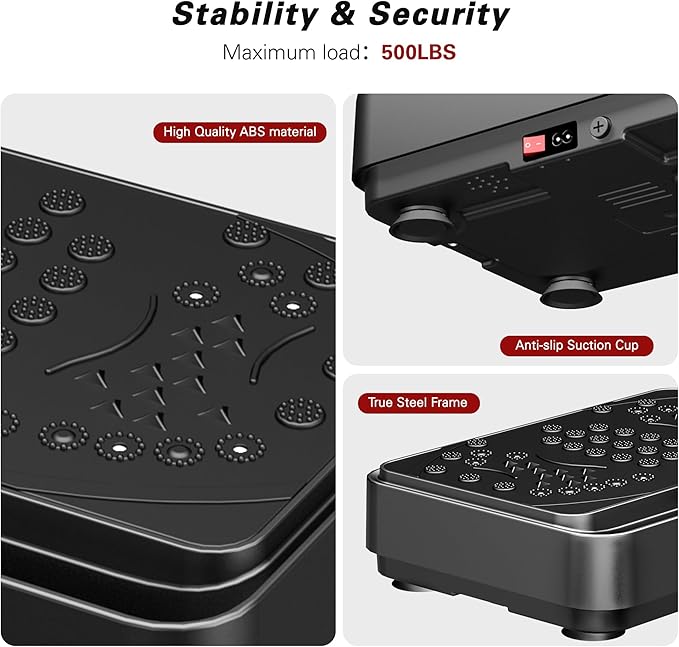 - 【Durable and Stable,Silent Exercise】This vibration plates for weight loss is made of impact resistant ABS material, with a load-bearing capacity of up to 500IBS; The bottom is equipped with four anti noise suction cups, which can ensure that you exercise in a quiet environment without disturbing the elderly, children, or busy family members who are sleeping at home. Comes with a factory fuse and circuit overload protection function, making home safer