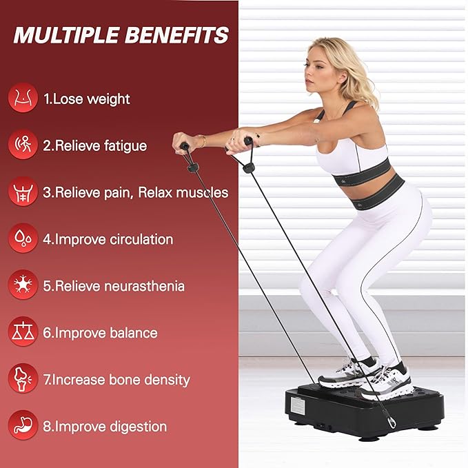 - 【Vibration plate with unique finger pressure surface】This full body vibration board exercise machine is equipped with a unique customized foot massage stone.When we use a weight loss vibration board,it can stimulate pressure points on our feet,massage our soles,and help relieve back pain,headaches,insomnia,poor blood circulation,muscle and joint pain,stress,and anxiety.