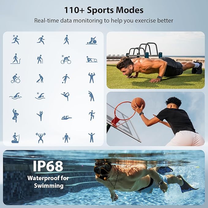 - PREMIUM FITNESS PARTNER: This fitness tracker supports up to 110+ mainstream exercise modes, acquires advanced metrics for various workouts, and tracks the intensity of your workout.Its IP68 waterproof rating ensures confidence during aquatic adventures or daily use.