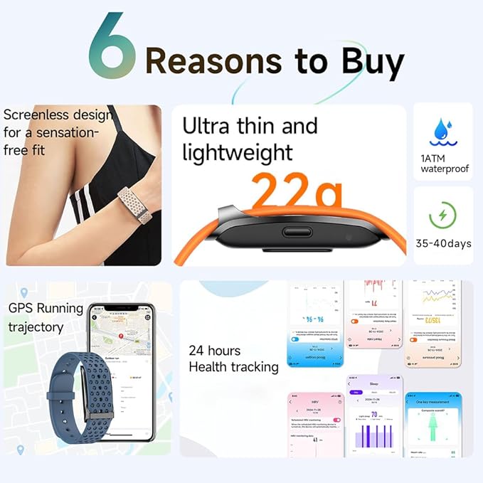 - New Ultra-Lightweight Material: Our smart fitness tracker is crafted from lightweight materials and features a compact design, ensuring it fits perfectly on your wrist for maximum comfort. With just one click to connect to your phone, you can easily start managing your fitness and health. The screenless design is impact-resistant, ensuring durability and resistance to spotlight interference, making it a reliable companion for all your activities